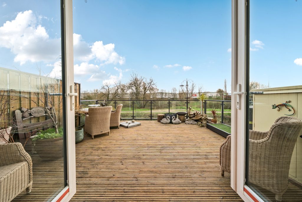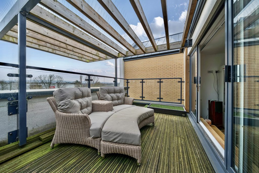 The accommodation comprises Entrance Hall, Kitchen / Breakfast Room with French doors to South-East facing terrace, Bedroom 3 with fitted wardrobes, Cloakroom, Master Bedroom with fitted wardrobe, Ensuite Shower Room and door to Balcony, Further Bedroom, Family Bathroom and Living Room on top floor with double doors to terrace.